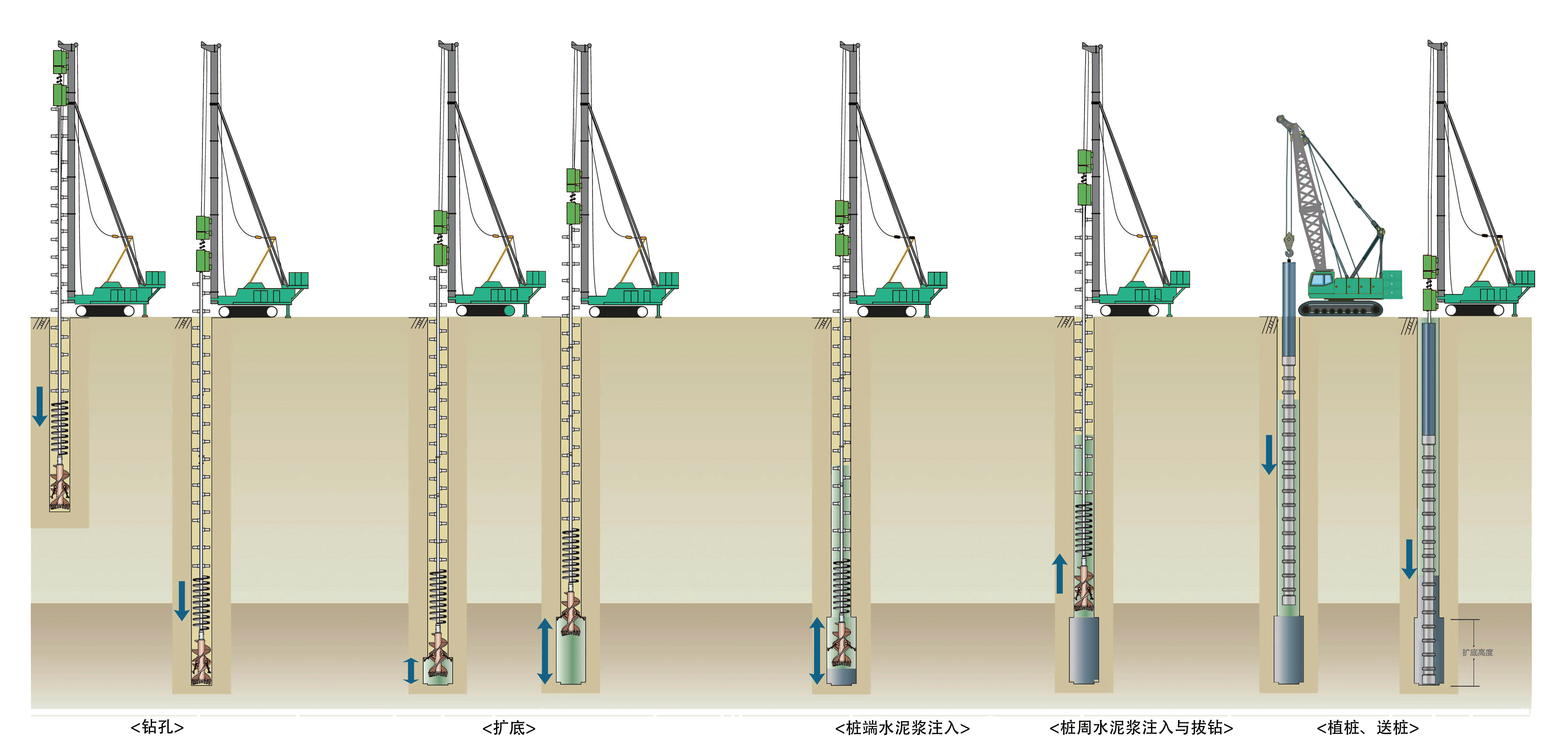 ③桩端水泥浆注入:扩底完成后注入桩端水泥浆,注入时上下反复升降钻机,确保全部注入扩底部分,并保证桩端水泥浆的均匀。