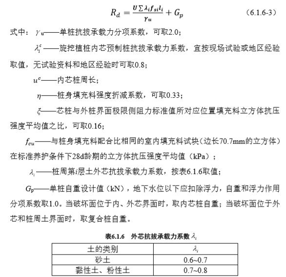 (1)旋挖植桩破坏面位于芯桩和外桩的内界面时,单桩竖向抗拔承载力设计值按下式进行估算: