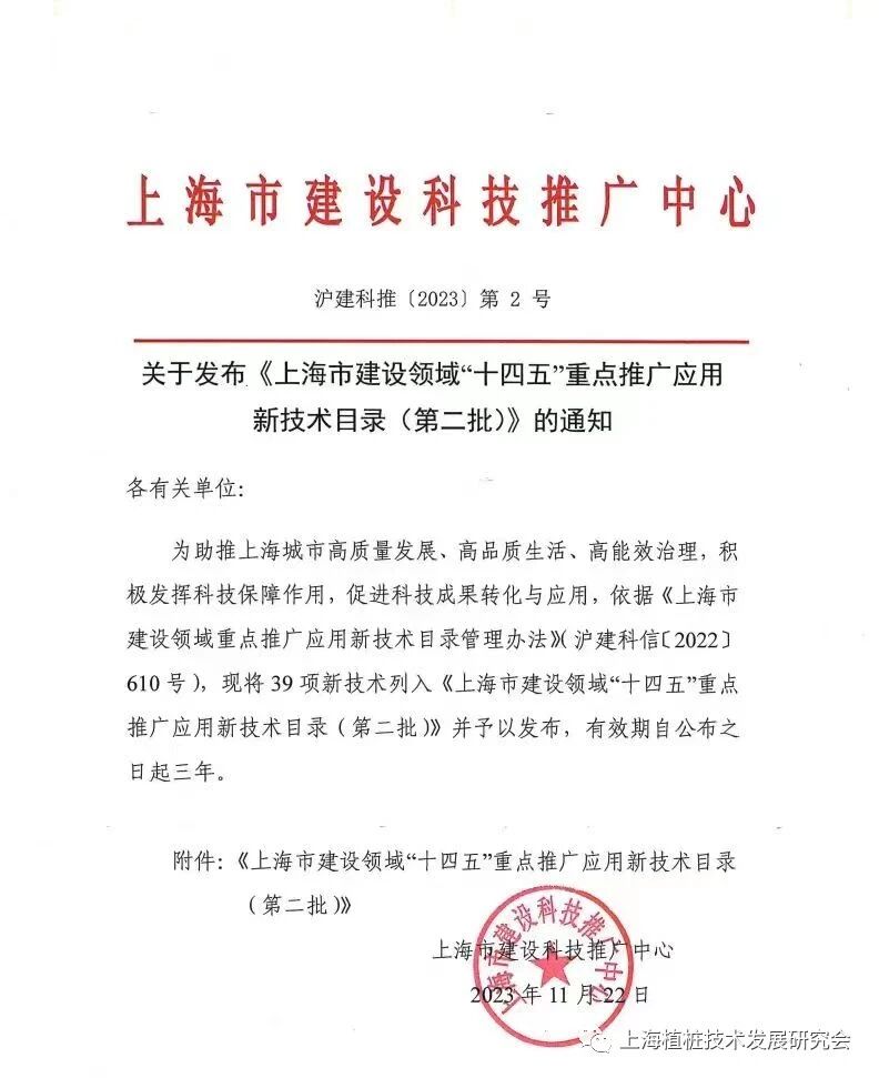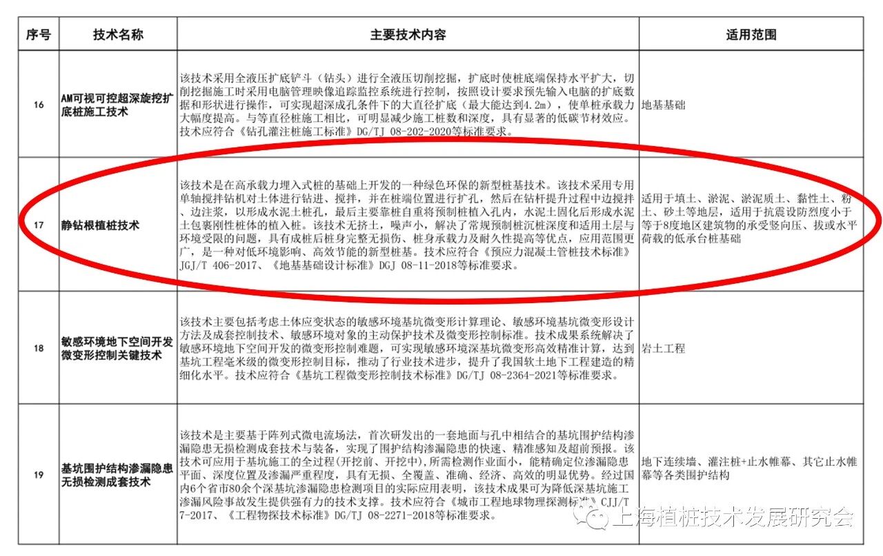 11月25日,上海市住房城乡建设行业科技大会暨长三角建设科技发展论坛成功举办。为积极发挥科技支撑作用,促进住建领域科技成果转化与应用,根据《上海市住房和城乡建设管理委员会关于加快推进本市住房和城乡建设管理领域科技创新的实施意见》和《上海市建设领域重点推广应用新技术目录管理办法》,大会上发布了《上海市建设领域“十四五”重点推广应用新技术目录(第二批)》(以下简称《推广目录(第二批)》),静钻根植桩技术成功入选。