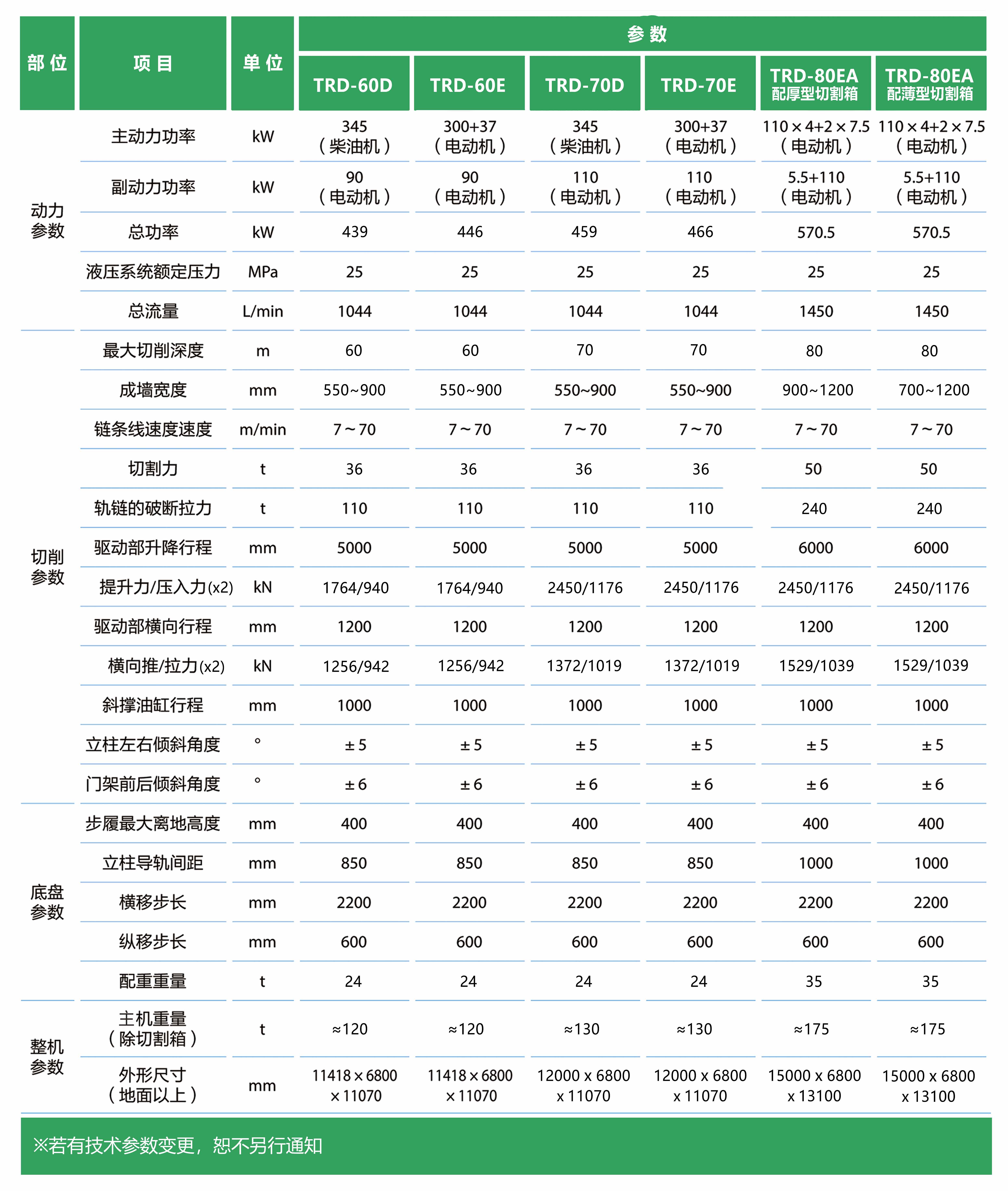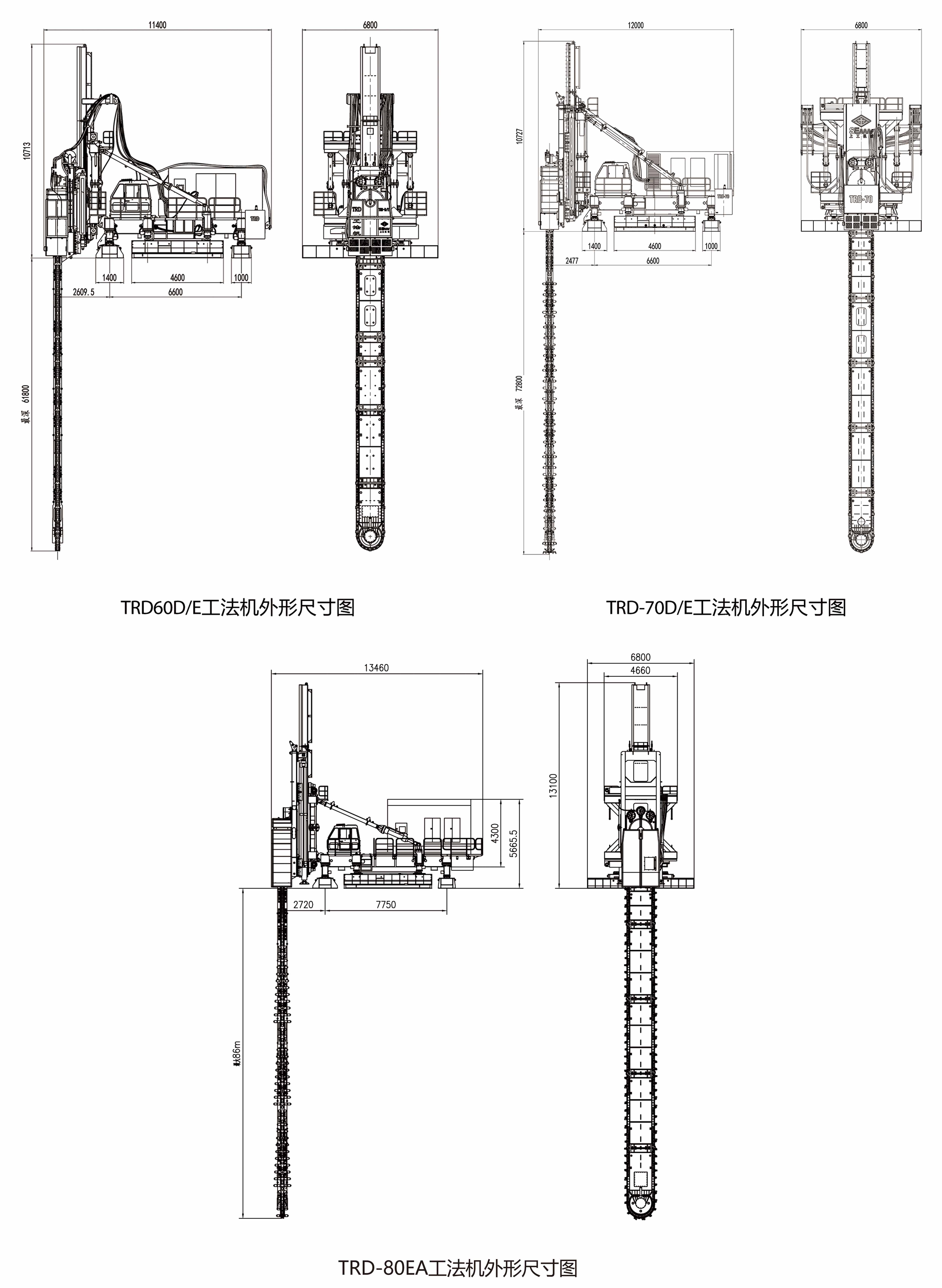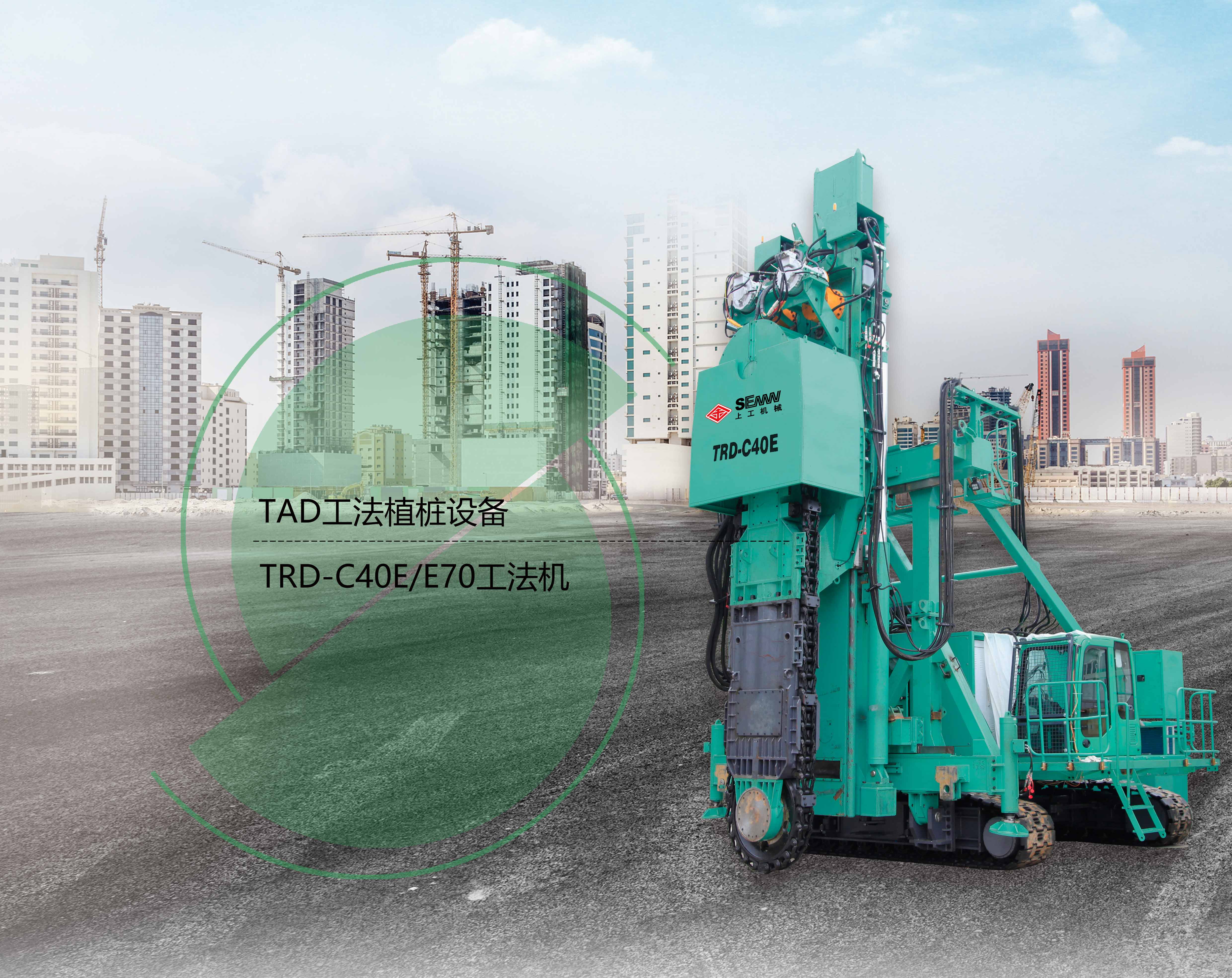 TRD工法由专业设备TRD工法机来实现。TRD 60D/E型最大施工深度达到61m,最大成墙宽度 900mm, TRD-70D/E型最大施工深度达到70m,最大成墙宽 度900mm; TRD-8OE型 最大施工深度达到86m,最大成墙宽度1200mm。