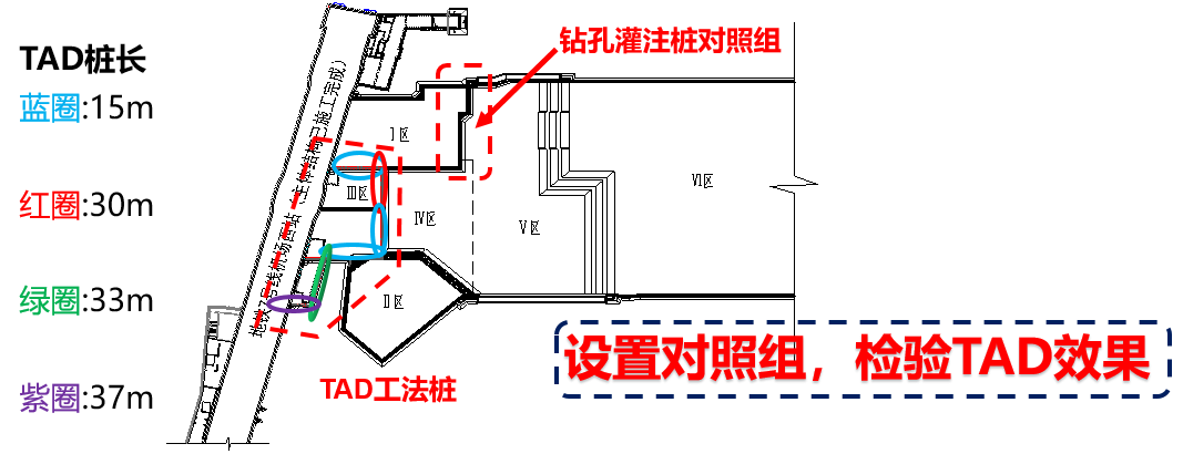 基坑分为6个区域,如下图所示,圆圈部分为TAD墙位置,箭头指向位置为钻孔灌注桩对照组。基坑开挖顺序为I、II、VI→III→IV→V,待基础底板及传力带全部施工完成后,地下室整体向上施工;