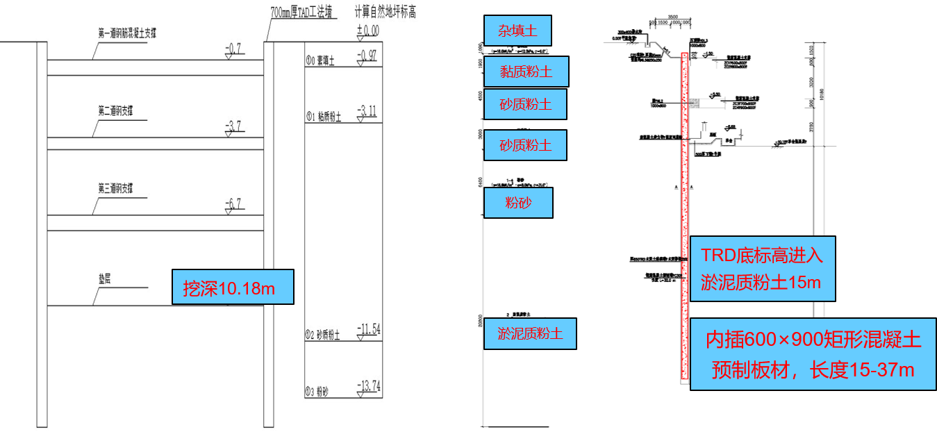 8)本工程采用850mm厚TRD连续墙,TAD工法预制桩体截面为600mm×900mm,TAD桩长主要分为15m,30m, 33m,37m ;