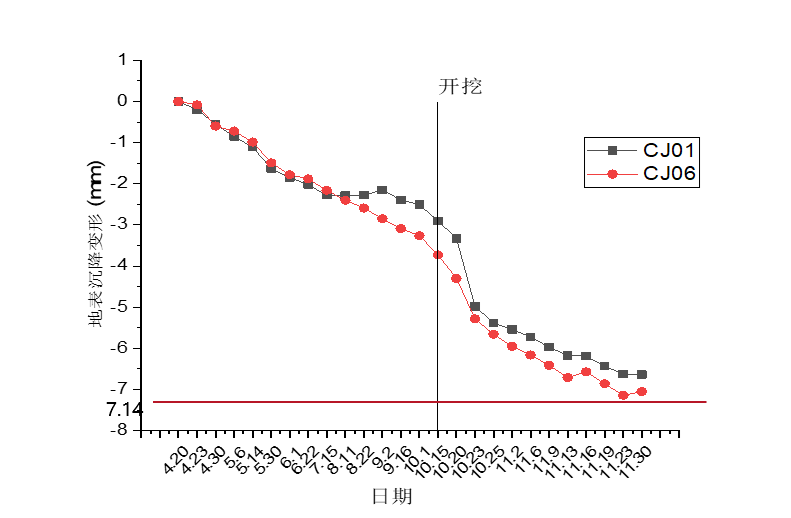 随着基坑施工进度的开展,地表沉降越来越趋于稳定,最终沉降值为7.14mm,远未超过预警值16mm。