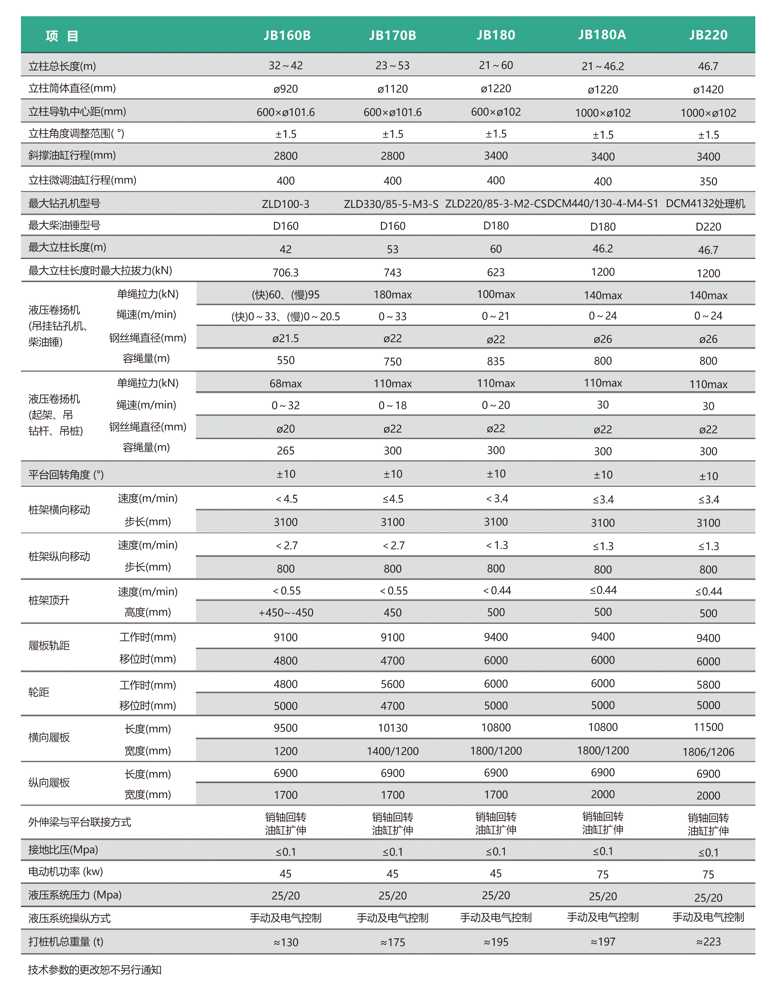 1、采用大容量卷筒,JB170最高53米立柱,配合超深三轴连续墙钻 机,施工最大深度可达46米,配合ZLD五轴连续墙钻孔机施工时 最大深度达30米。 JB170顶升油缸增至8个,增加场地适应性。