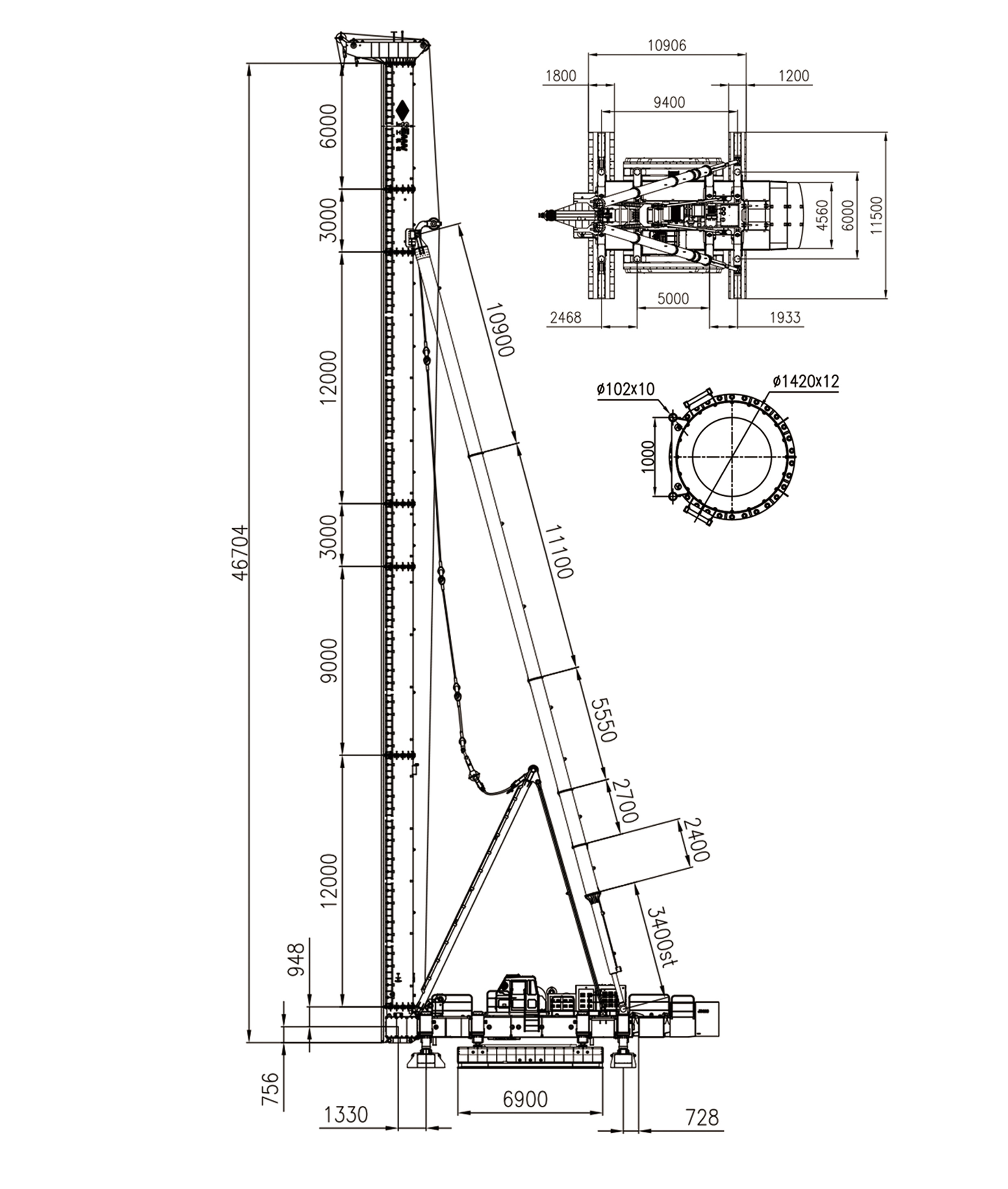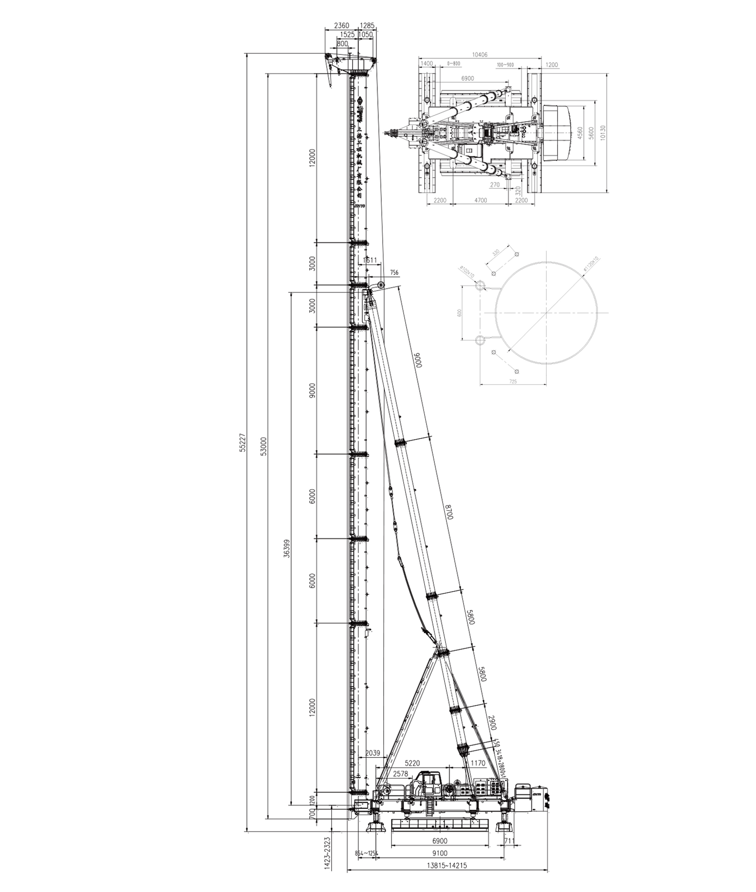 2、独有的自行起架机构,不借助辅助起重机, JB170可完成53 米立柱自行起架作业。